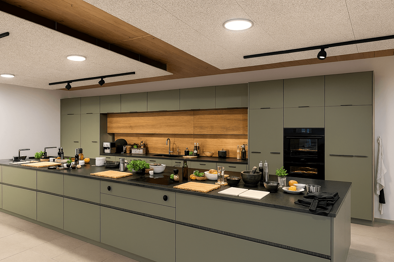 Unser Eventraum mit Showküche für bis zu 80 Personen verbindet modernes Design mit natürlicher Wärme. Helle Holzelemente, stimmungsvolle Lichtakzente und viel Liebe zum Detail schaffen eine einladende Atmosphäre.